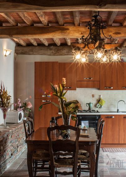 -al pian terreno si accede da un ampio locale caratterizzato da archi e muri in pietra, in cui troviamo un disimpegno, salotto con camino e divano letto, tavolo e cucina abitabile accessoriata di frigo, freezer, forno ventilato, fuochi a gas, tutto con finiture rustiche e affaccio sul giardino circostante, oltre a un bagno di servizio.