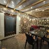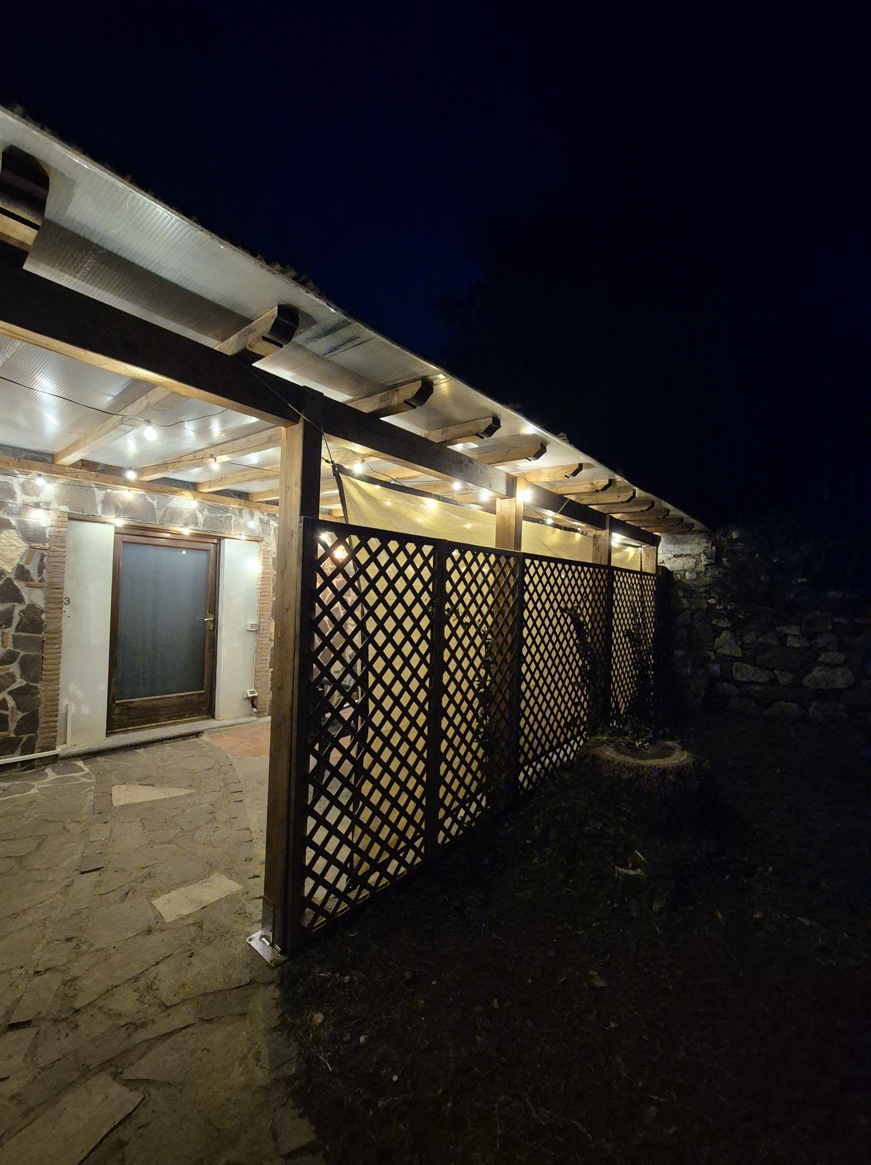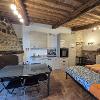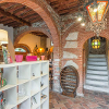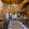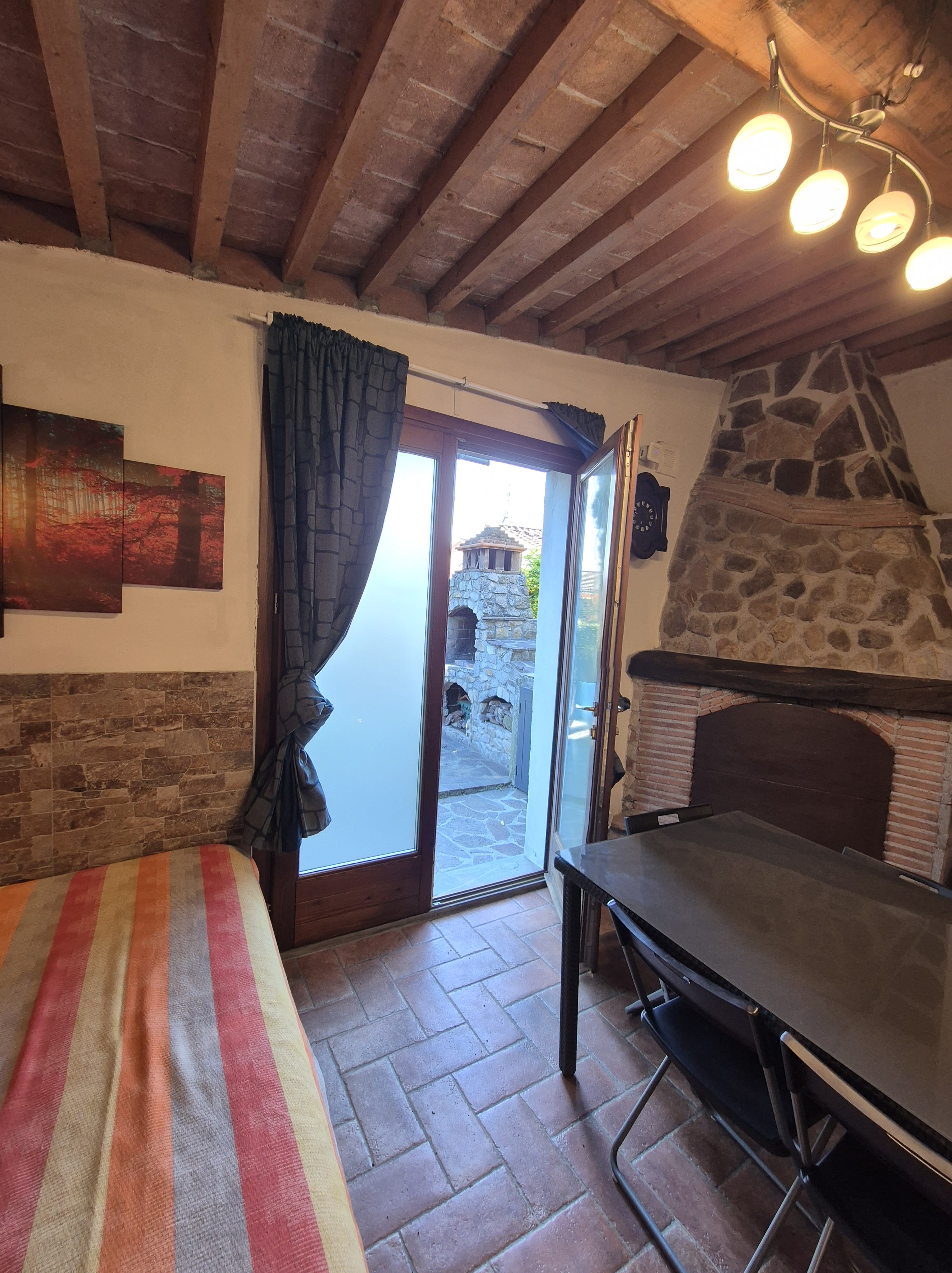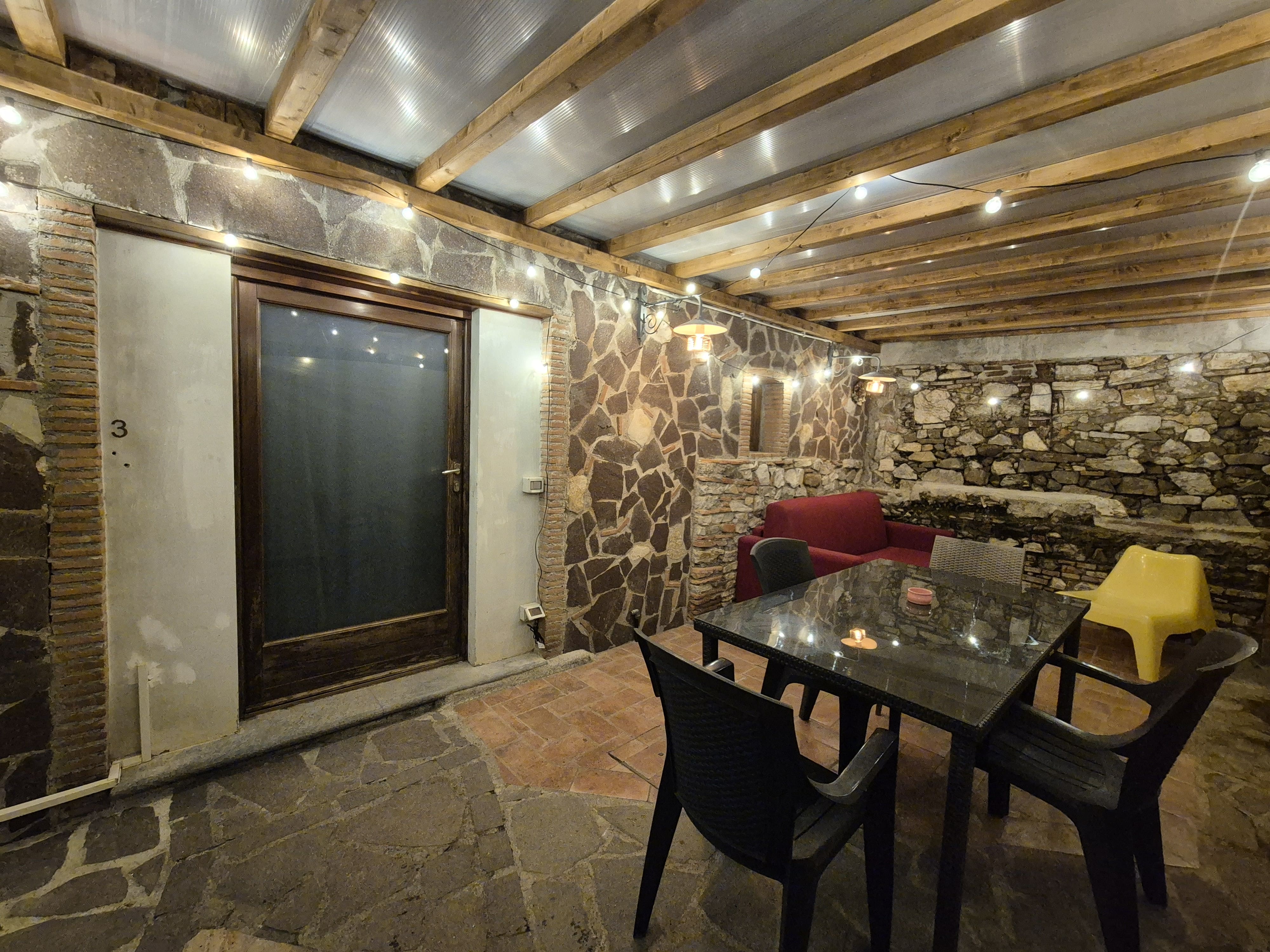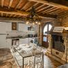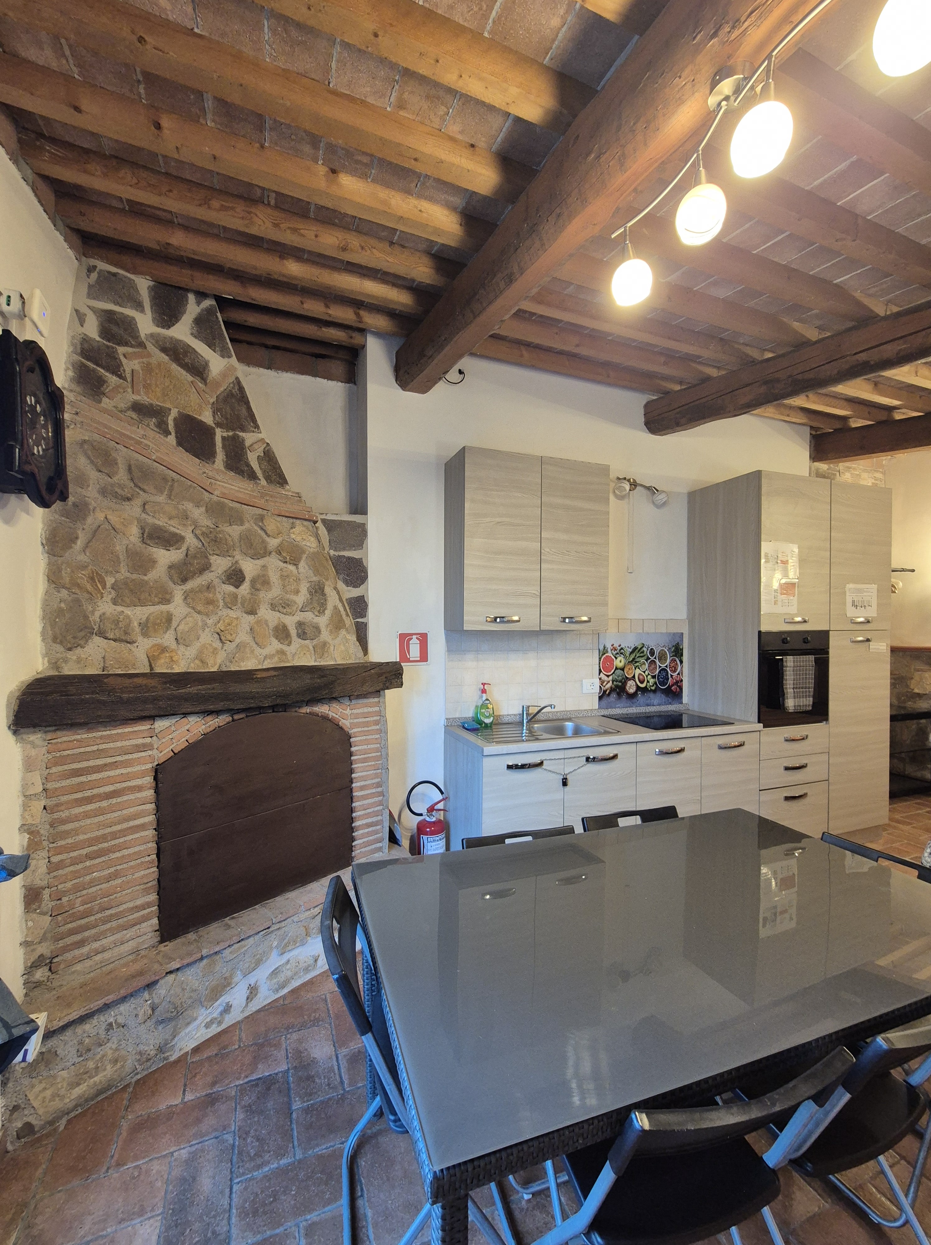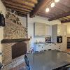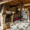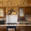 -al pian terreno si accede da un ampio locale caratterizzato da archi e muri in pietra, in cui troviamo un disimpegno, salotto con camino e divano letto, tavolo e cucina abitabile accessoriata di frigo, freezer, forno ventilato, fuochi a gas, tutto con finiture rustiche e affaccio sul giardino circostante, oltre a un bagno di servizio.