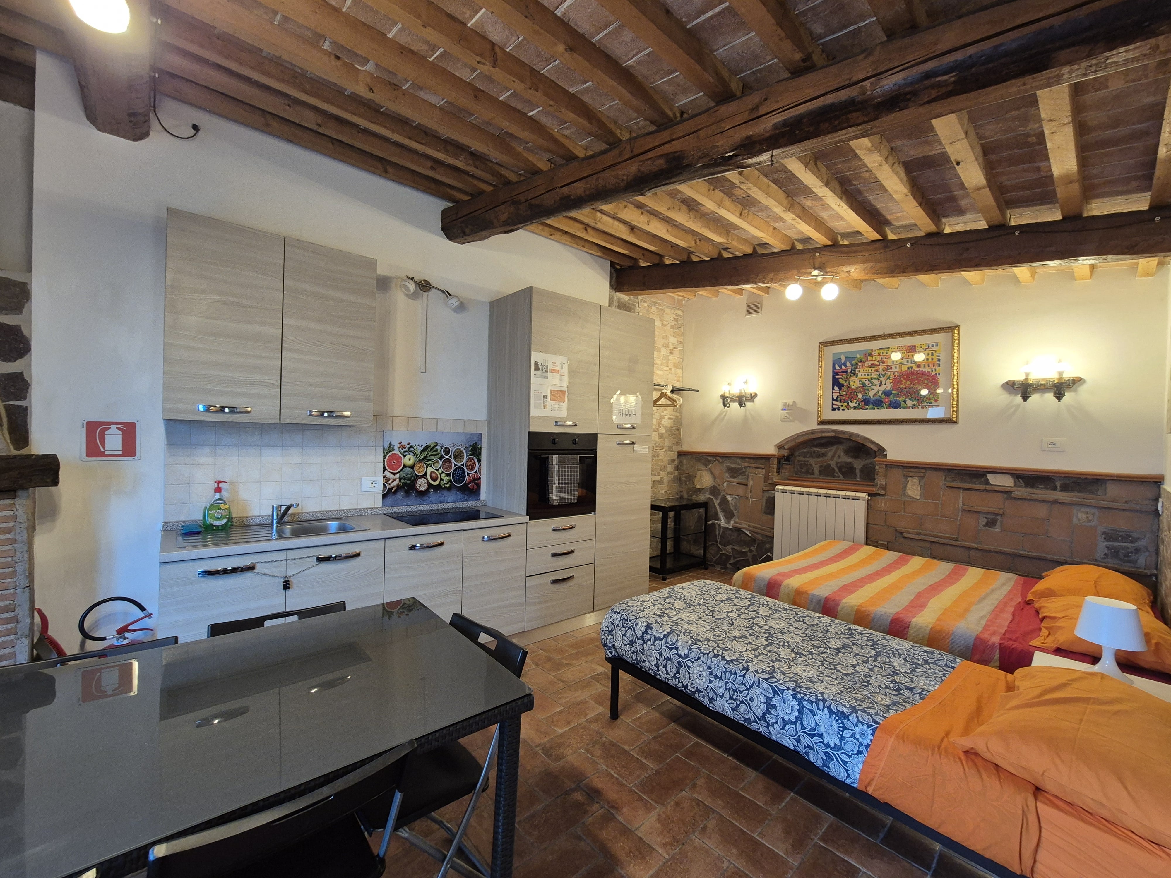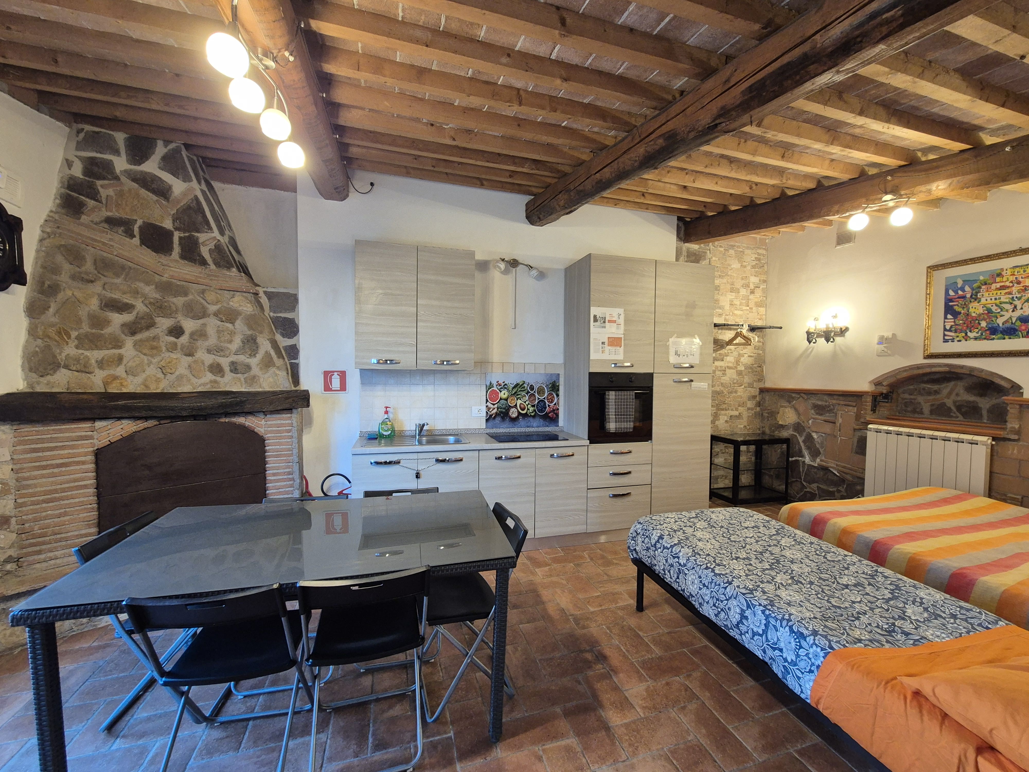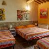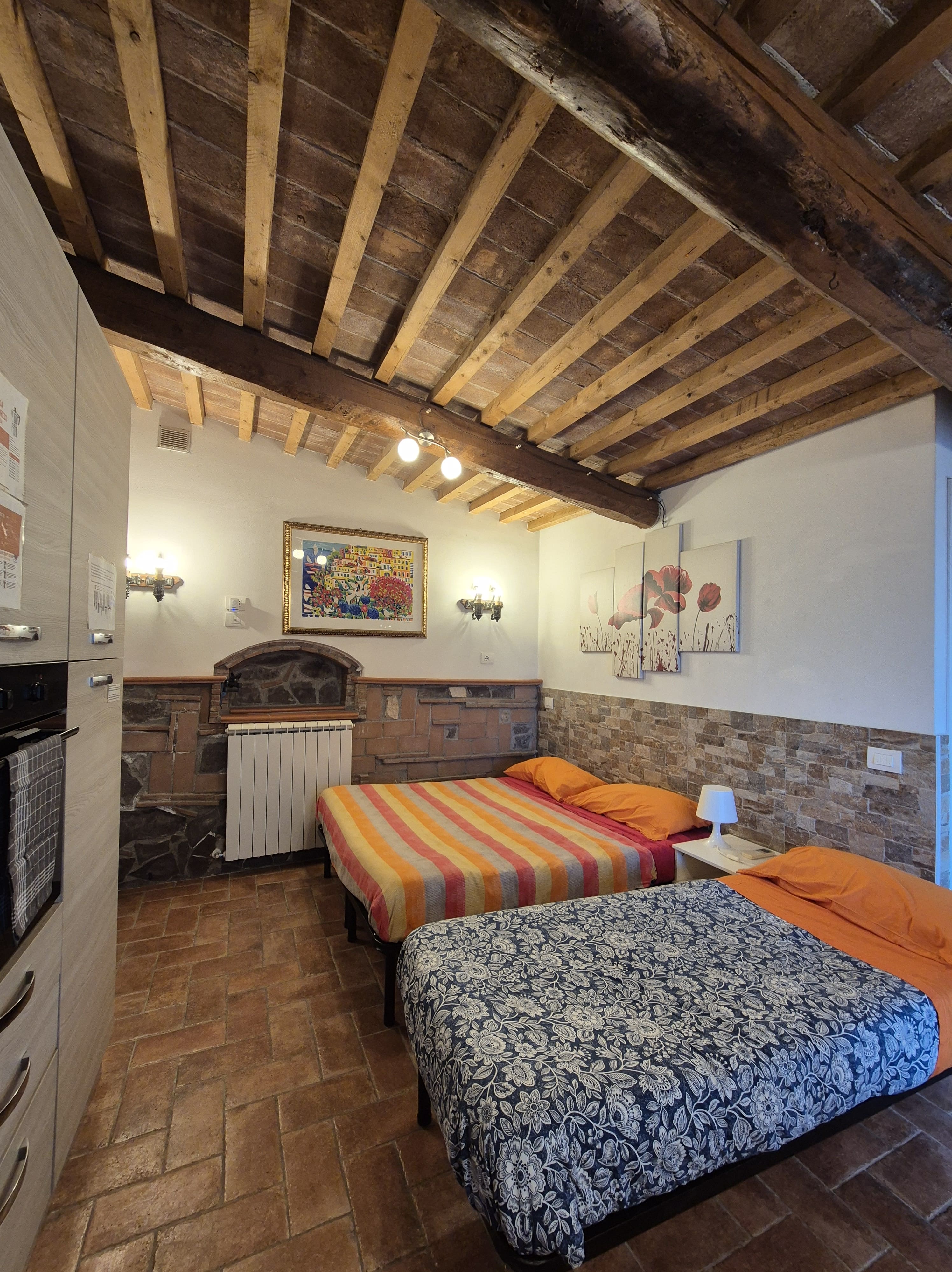 -Al piano secondo altre tre stanze con bagno completo, tetto in travi e travicelli, pavimento in parquet e vista sulle colline circostanti. Sono presenti 3 letti matrimoniali e un salotto con un divano letto e 3 letti singoli. Bagno completo.